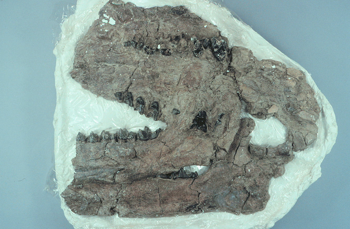 Skull of bear-like mammal, Titanoides, Sentinel Butte Fm., Billings Co., length 300 mm. USFS