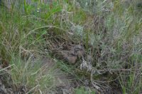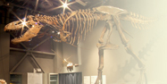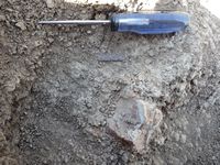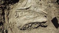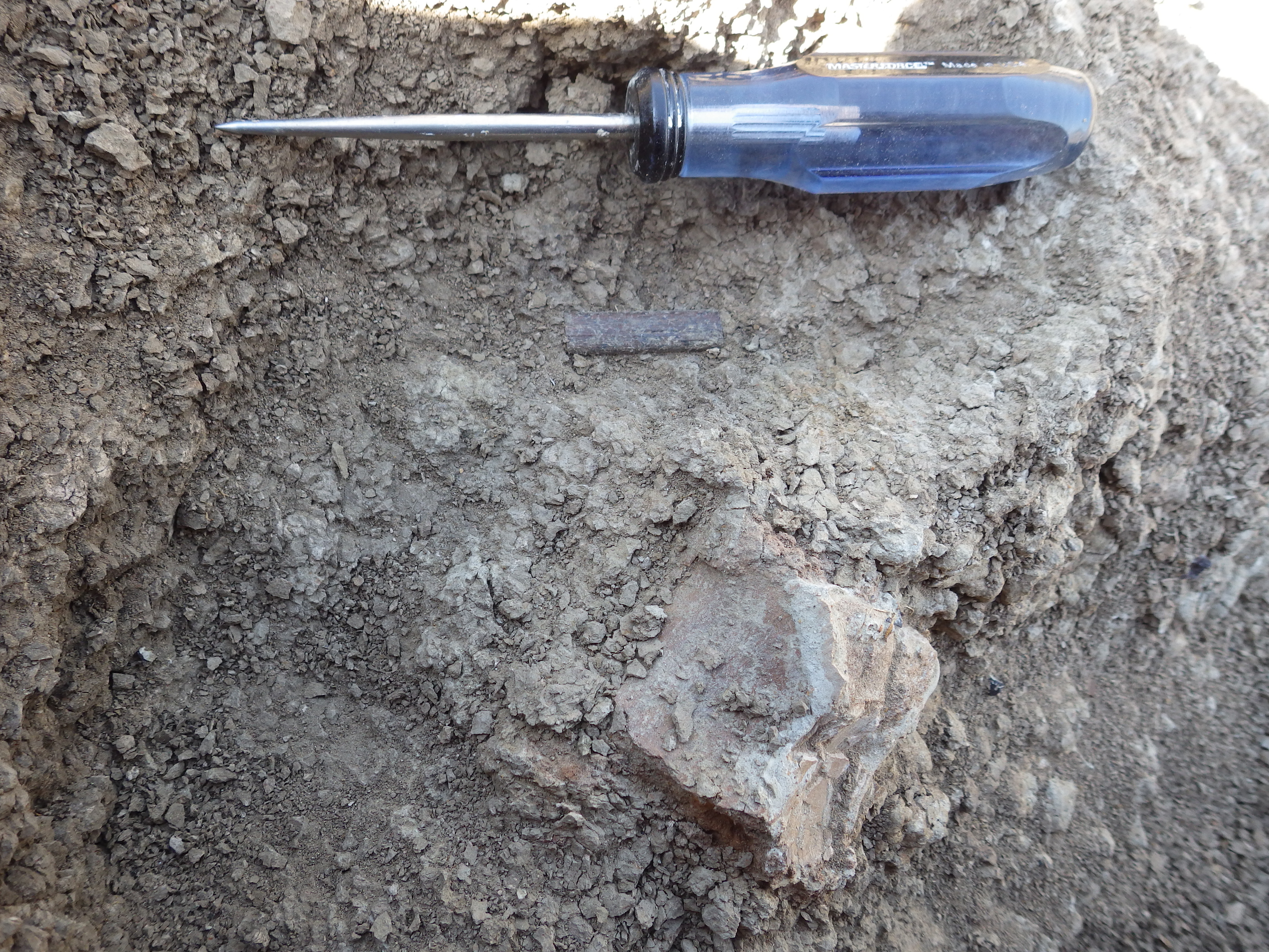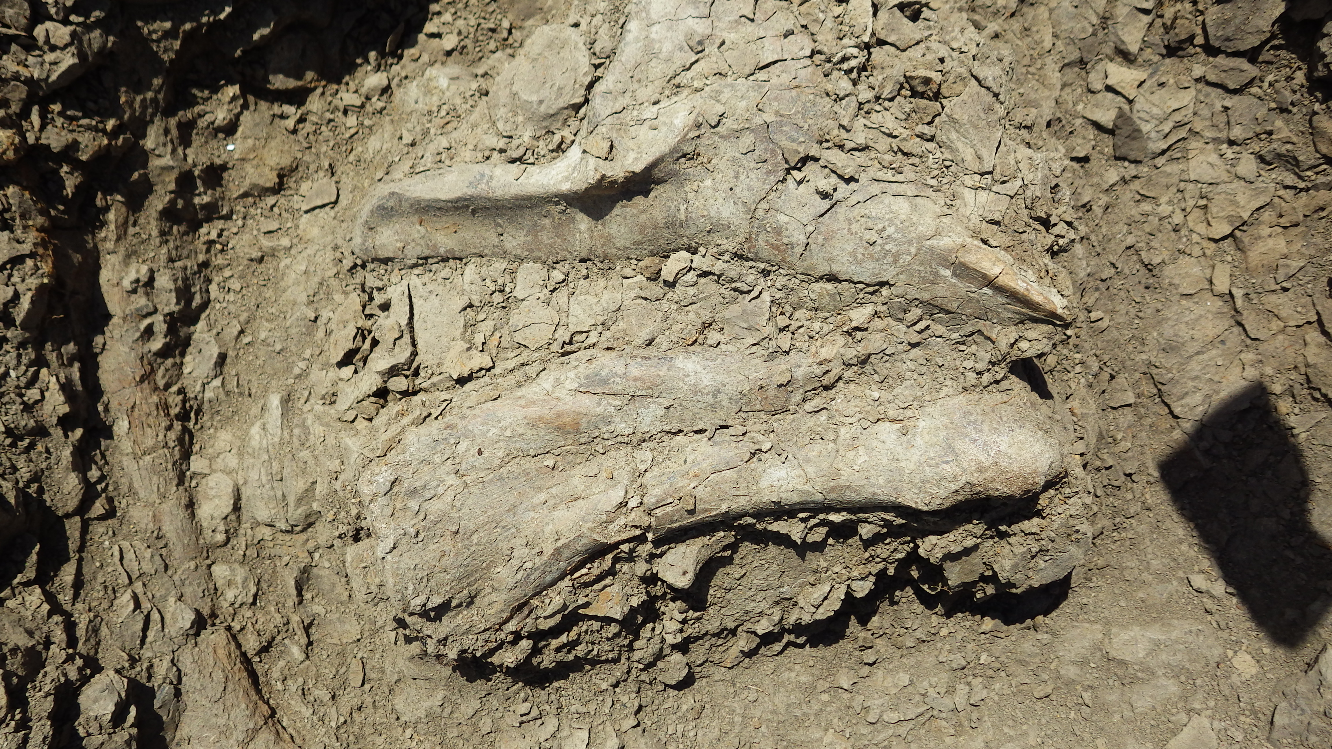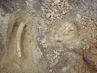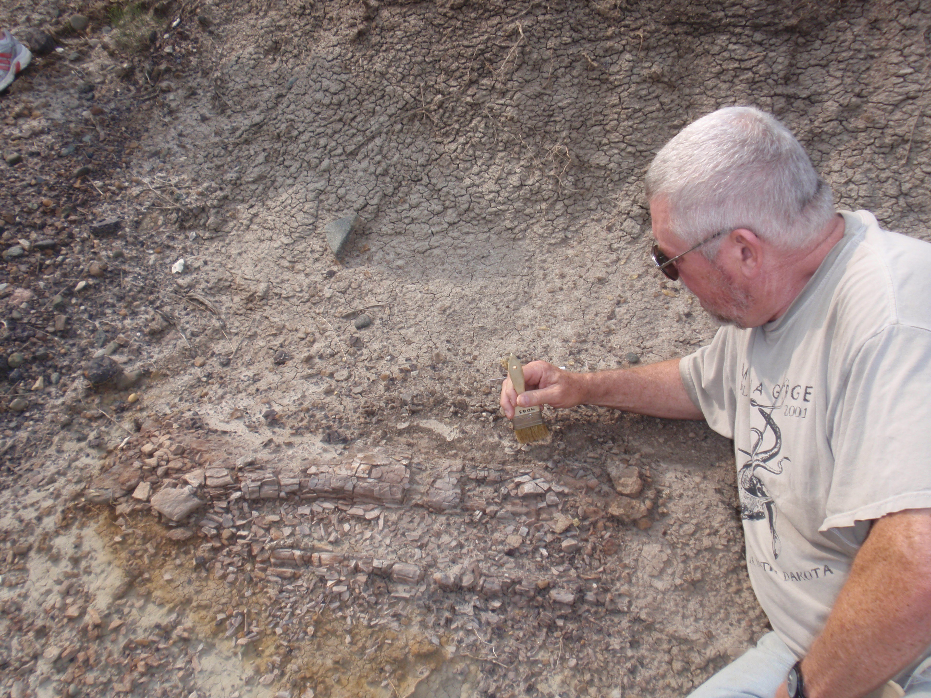 Jim Daly carefully uncovers a 65 million year old dinosaur leg bone.