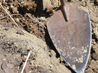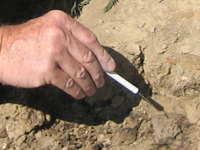 Paleontologist Becky Barnes hammering in grid stakes for mapping fossils.