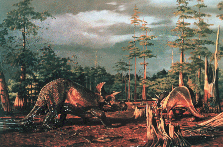 Late Cretaceous habitat reconstruction of western North Dakota with Triceratops Dinosaur. Painting by, and courtesy of, the Canadian Museum of Nature, Ottawa, Canada, and artist Eleanor Kish . |