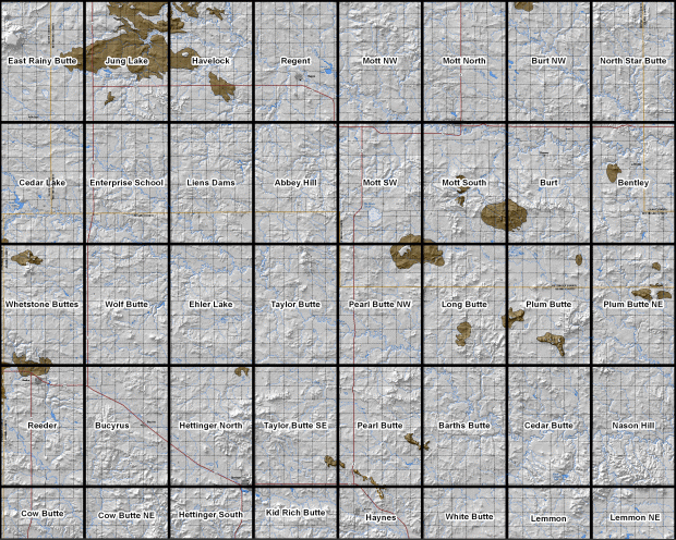 Bentley Burt Burt NW Cedar Lake East Rainy Butte Havelock Hettinger North Jung Lake Long Butte Mott South Mott SW Pearl Butte Pearl Butte NW Plum Butte Plum Butte NE Reeder Taylor Butte SE Whetstone Buttes Haynes